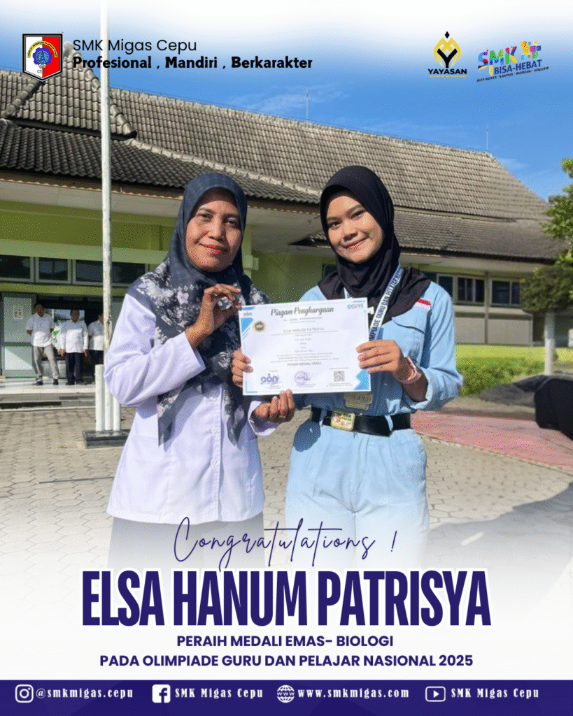 Prestasi membanggakan kembali diraih oleh salah satu siswi SMK Migas Cepu. Elsa Hanum Patrisya, siswi kelas 11 PMP A ( International Class) SMK Migas Cepu, berhasil meraih Medali Emas bidang Biologi pada ajang Olimpiade Guru dan Pelajar Nasional (OGPN) 2025.