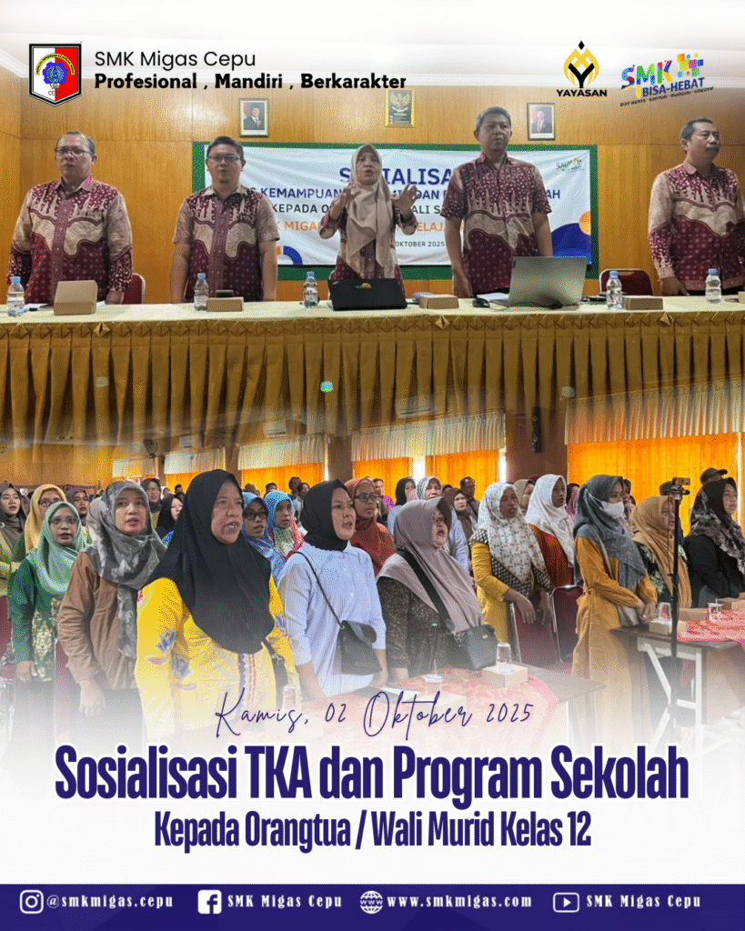 Pada Kamis, 02 Oktober 2025, SMK Migas Cepu menyelenggarakan kegiatan sosialisasi Tes Kemampuan Akademik (TKA) dan program sekolah yang ditujukan kepada orang tua/wali murid kelas XII. Kegiatan ini dilaksanakan di Aula SMK Migas Cepu Kampus 1 dan dihadiri oleh kurang lebih 300 orang tua/wali siswa.